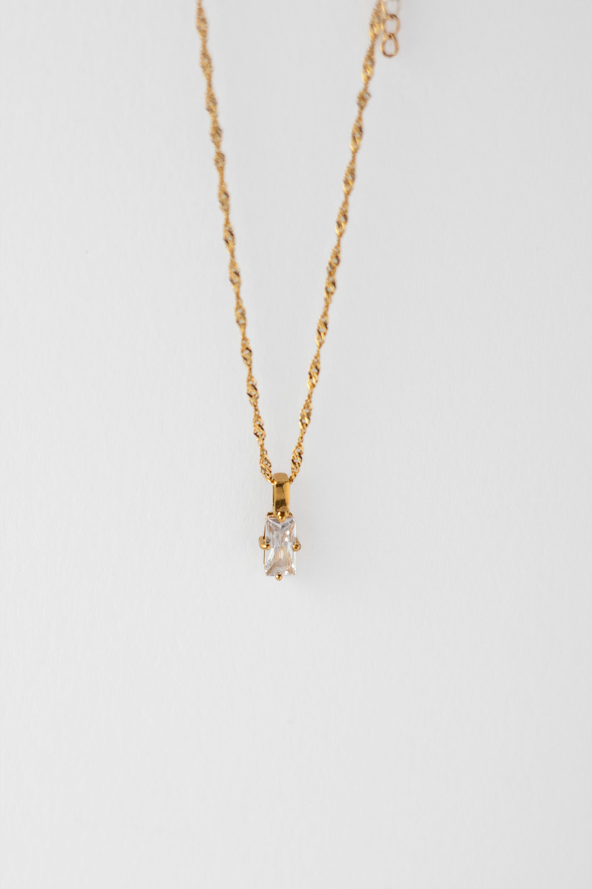 A slender stone floats on a fine twisted rope chain. Minimal yet radiant, designed to sit close and reflect the light. Chain length: 45 + 5cm.